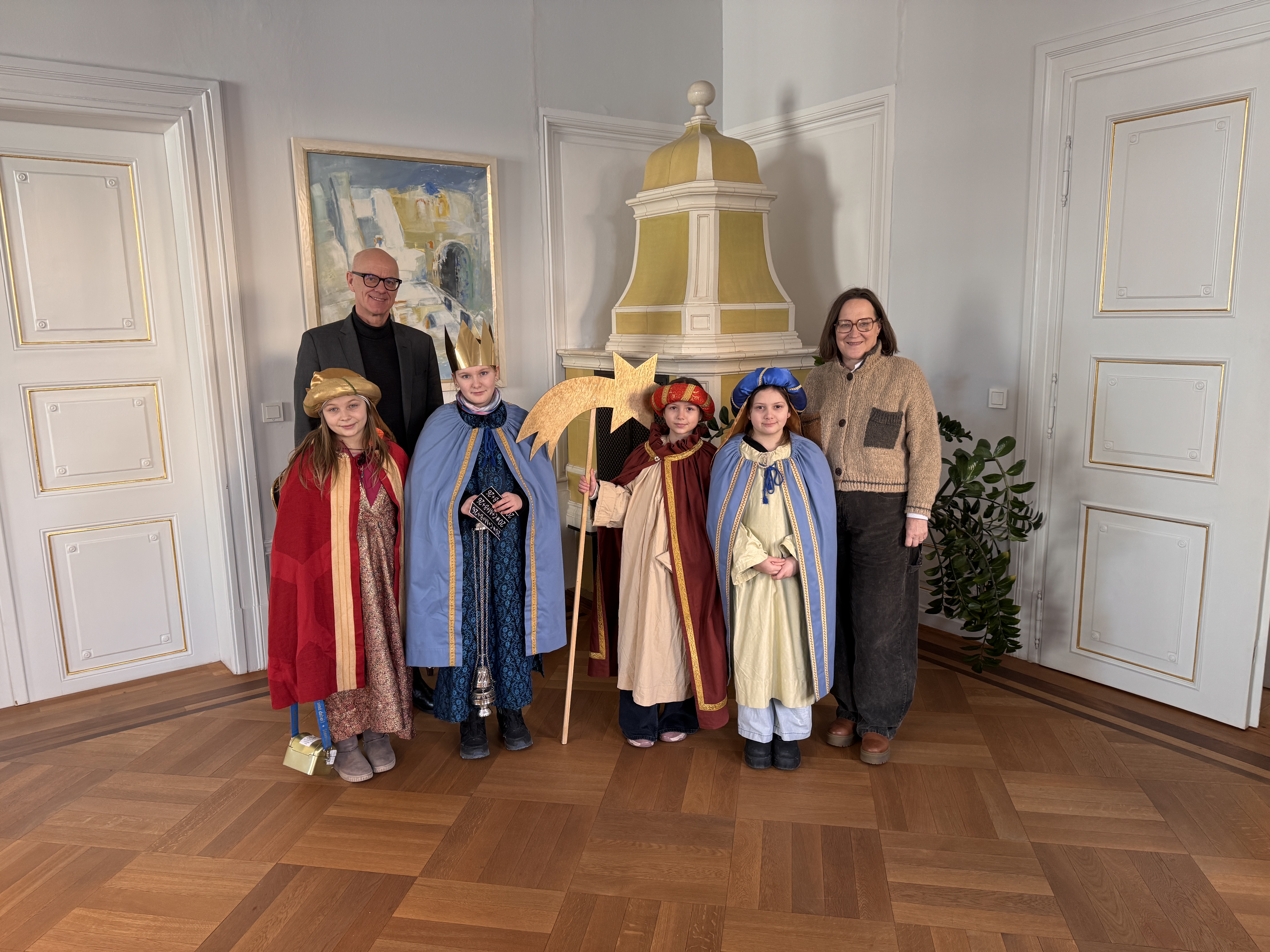 05.01.2026-001Regensburg. Mit Stern, Segensspruch und viel Engagement für benachteiligte Kinder weltweit haben die Sternsinger auch in diesem Jahr die Regierung der Oberpfalz besucht. Regierungspräsident Walter Jonas empfing die „kleinen Könige“ aus der Dompfarreiengemeinschaft St. Emmeram/St. Ulrich zum traditionellen Neujahrsbesuch.